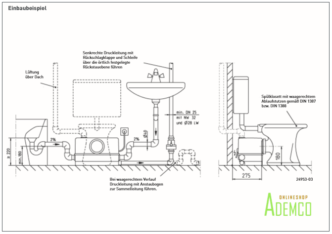Durch die kompakte Bauweise dieser Hebeanlage zur begrenzten Verwendung ist der direkte Anschluss an ein Stand-WC mit mind. 6 L Spülmenge möglich.