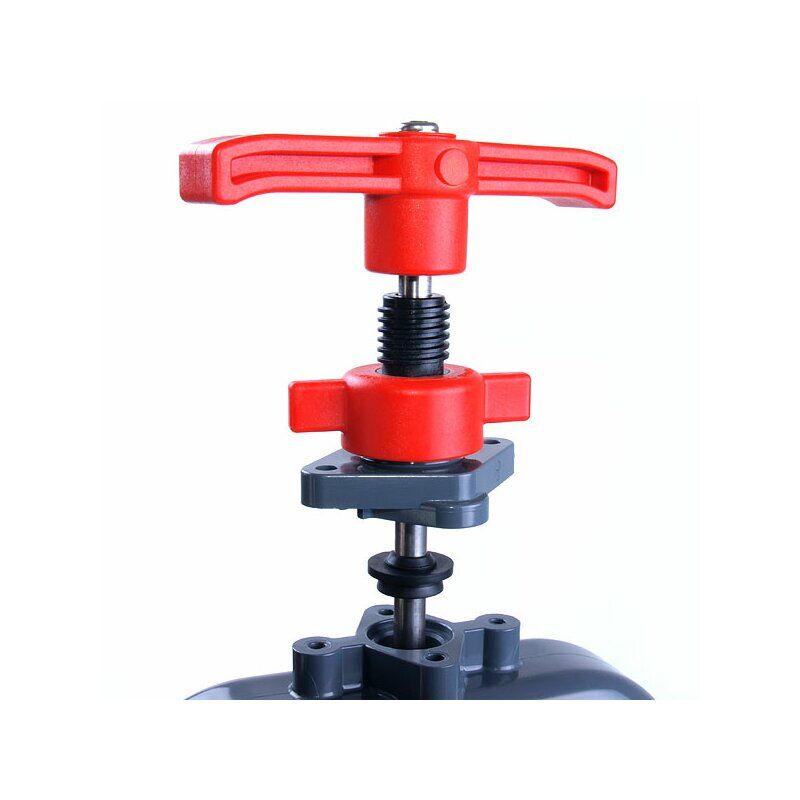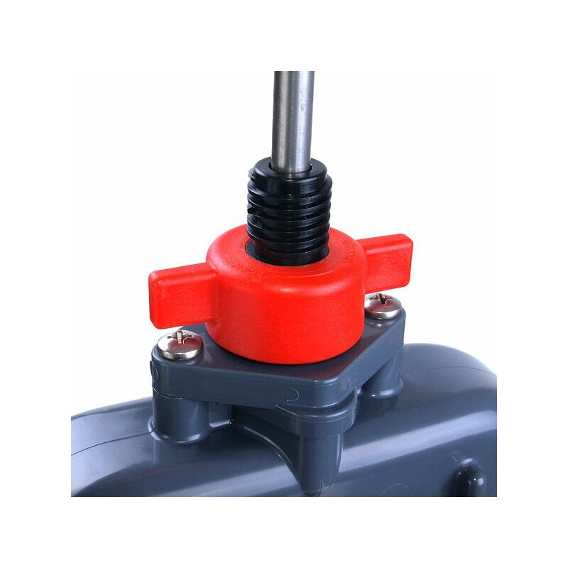 Über eine Überwurfmutter an der Oberseite des Zugschiebers kann die Stange, an der sich der Griff befindet, festgeschraubt werden. So kann die Platte des Schiebers in jeder beliebigen Position fixiert werden.