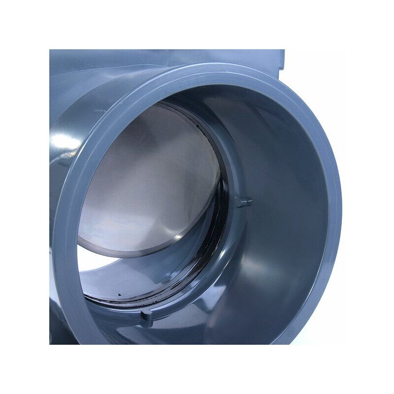 Bei den meisten Zugschiebern wird das Schwert zwischen zwei Lippendichtungen hindurchgeschoben. Diese beiden Dichtungen sind einzeln. Im geschlossenen Zustand liegt dann auf jeder Seite der Platte eine Dichtung an und dichtet so ab. Bei diesem Zugschieber hier wurde eine andere Vorgehensweise verfolgt. Die Dichtung besteht aus einem Stück und ist nach unten hin geschlossen. Die unterkannte des Schwerts liegt im geschlossenen Zustand auf der Dichtung auf. Dies bietet den großen Vorteil, dass keine Feststoffe beim Verschließen des PVC Zugschiebers 110 mm VDL zwischen die Dichtungen gedrückt werden können.